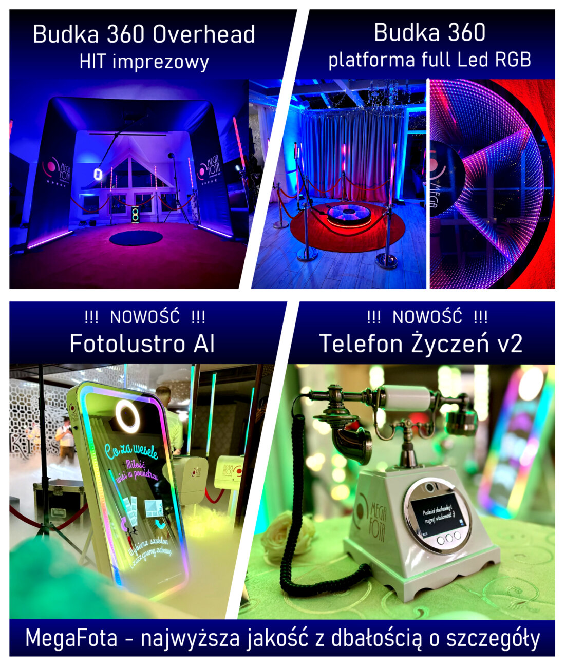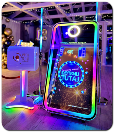 Stworzone, by zachwycać i angażować gości. Jego zaawansowane funkcje przenoszą pojęcie fotobudki na najwyższy poziom. Rewelacyjny stylowy wygląd oraz pełne barw zewnętrzne oświetlenie gwarantują efekt "wow" na każdym evencie. Nasze Fotolustro to prestiżowa atrakcja, które zapewni Twoim gościom niezapomniane emocje. Sprawdza się doskonale na weselach, imprezach firmowych, jubileuszach i każdej innej uroczystości, gdzie chcesz dodać odrobinę magii i luksusu. MegaFota oferuje Ci zupełnie nową jakość rozrywki, więc "zrób wesołe zdjęcie..., odbierz odbitki i pobierz wersję cyfrową za pomocą kodu QR na swój telefon, ponadto za chwilę Twoje super zdjęcie wyświetli projektor na sali balowej!