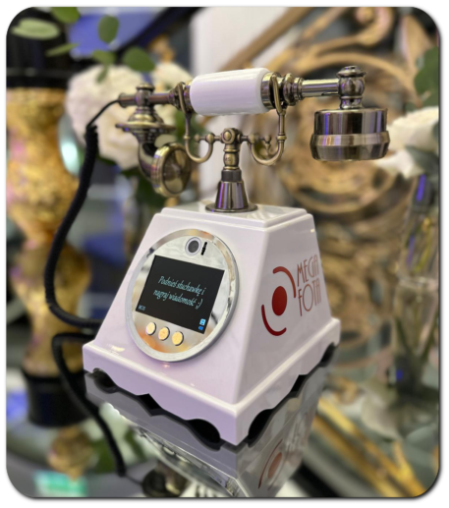 Absolutny hit wesel 2025! To nowoczesna atrakcja w stylu retro nagrywa nie tylko głos, ale i obraz w jakości 2K, tworząc wzruszające i zabawne wspomnienia od Waszych gości. Idealny sposób, aby zachować życzenia w wyjątkowej formie na lata! Wasi goście podnosząc słuchawkę usłyszą nagrana przez Was wiadomość. Następnie automatycznie uruchamia się kamera - goście nagrywając wiadomość widzą się na wyświetlaczu LCD.